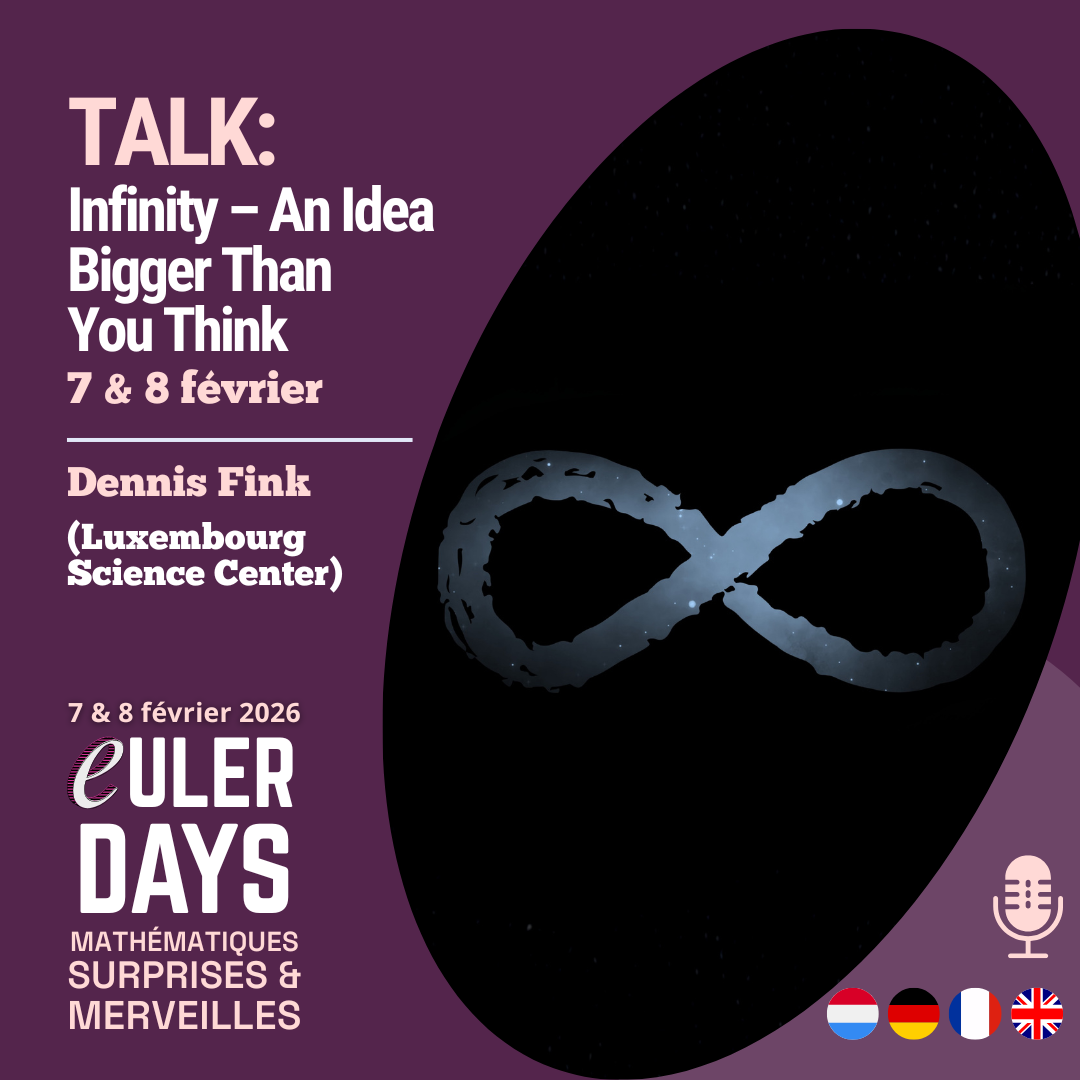 - TALK: Unendlichkeit – eine Idee größer als du denkst - "Tauchen Sie ein, in eine Welt in der Zahlen unendlich sind und die Intuition ständig herausgefordert wird" (Dennis Fink - Luxembourg Science Center) - FR, LU, DE & EN