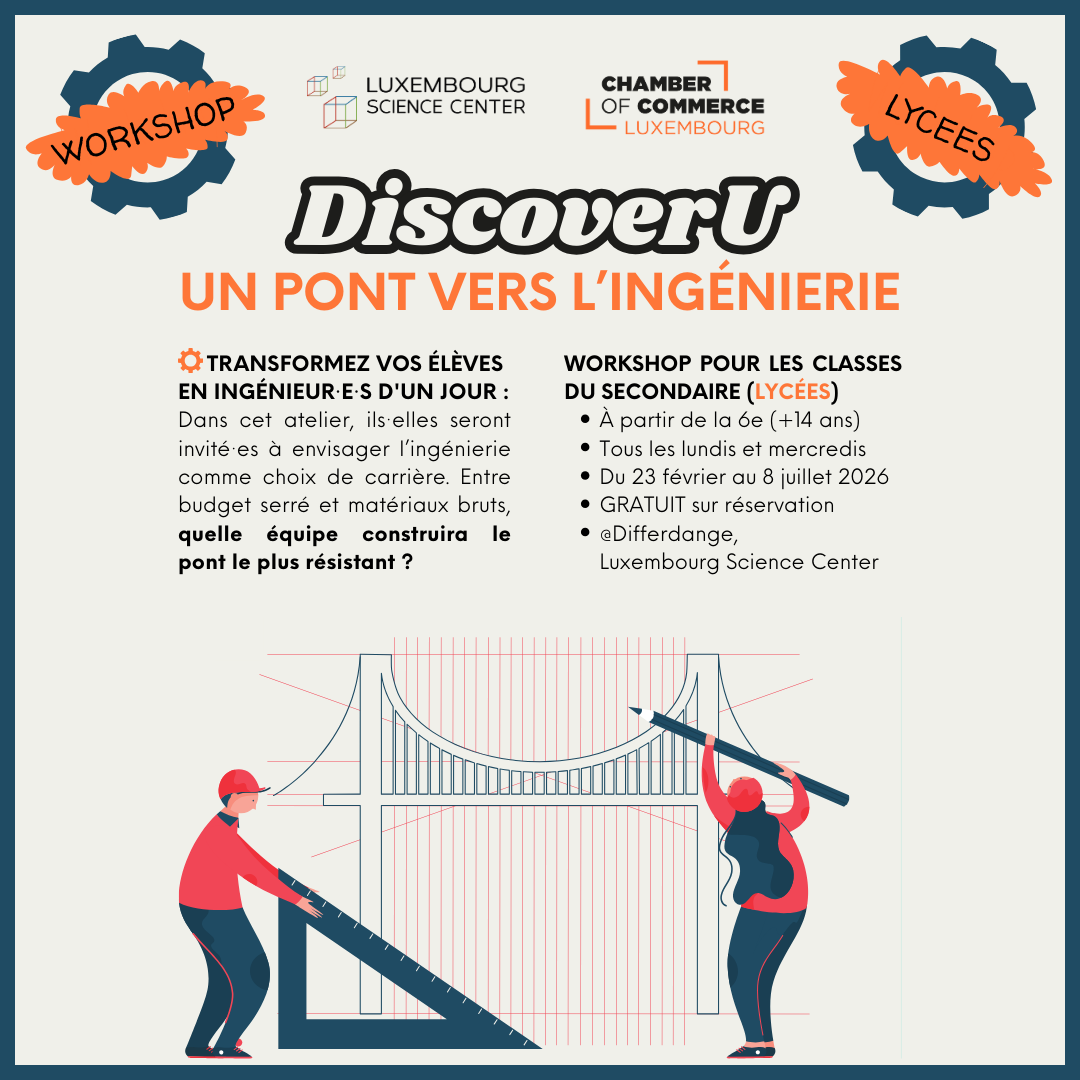 The Luxembourg Science Center in Differdange, in partnership with the Luxembourg Chamber of Commerce, is pleased to invite you to register your classes for FREE for its brand new workshop, “DiscoverU: a bridge to engineering.”